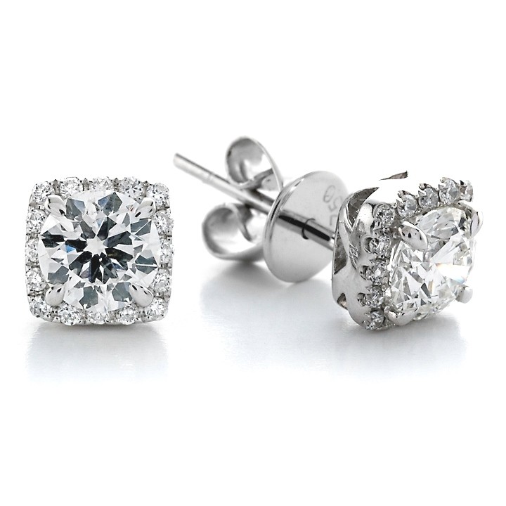 These Cushion Halo Studs are set in 18K white gold and feature a beautiful Forevermark diamond. Earrings are available in a range of sizes, qualities and metals
