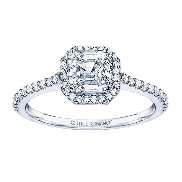 An elegant design, this diamond engagement ring showcases a prong-set diamond halo that crowns the Cushion Shaped center stone. This style accommodates various center stone sizes & shapes. Available in Platinum, as well as 18K and 14K White, Yellow or Rose Gold. Priced as shown 0.34cts 14K WG