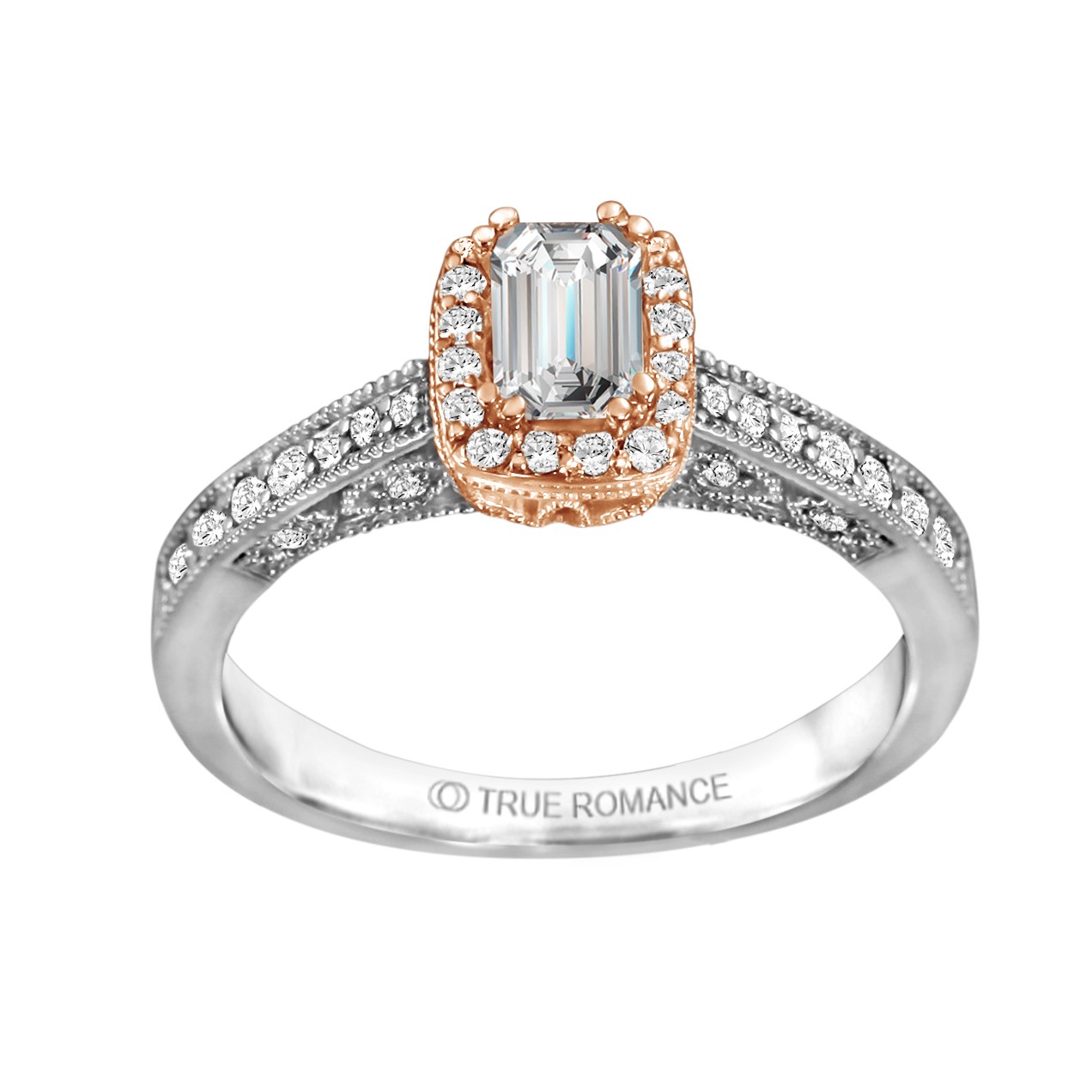 An elegant design, this diamond engagement ring showcases a prong-set diamond halo that crowns the center stone within a vintage styled design. This style accommodates various center stone sizes & shapes. Available in Platinum, as well as 18K and 14K White, Yellow or Rose Gold. Priced as shown 0.34cts Two Tone