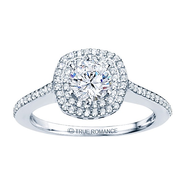 An elegant design, this diamond engagement ring showcases a prong-set diamond double halo that crowns the round center stone. This style accommodates various center stone sizes & shapes. Available in Platinum, as well as 18K and 14K White, Yellow or Rose Gold. Priced as shown .54cts 14K White Gold