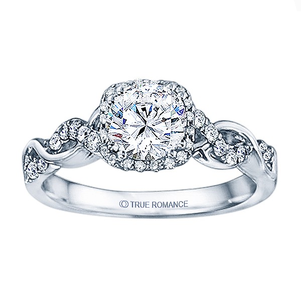 An elegant design, this diamond engagement ring showcases a prong-set diamond halo that crowns the center stone on top of an infinity styled ring. This style accommodates various center stone sizes & shapes. Available in Platinum, as well as 18K and 14K White, Yellow or Rose Gold. Priced as shown .33cts 14K WG.